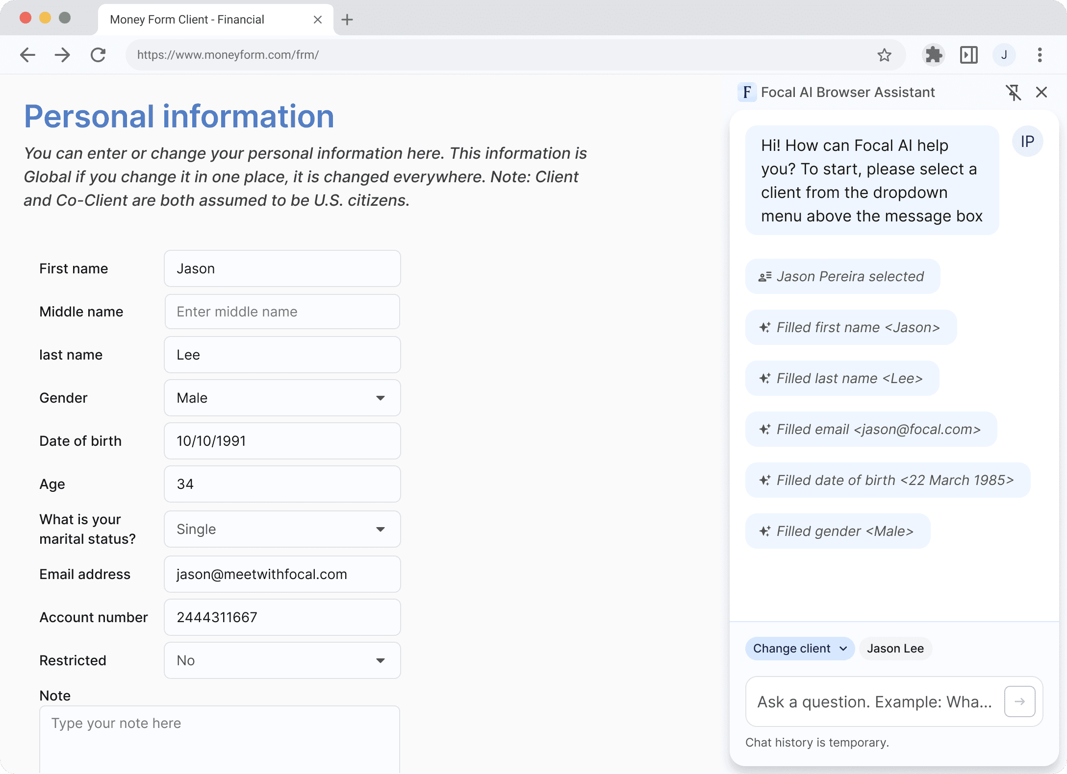 Save hours every week by letting Focal fill in supported forms & documents within your browser, and retrieve client information across all your tools no matter where you are.