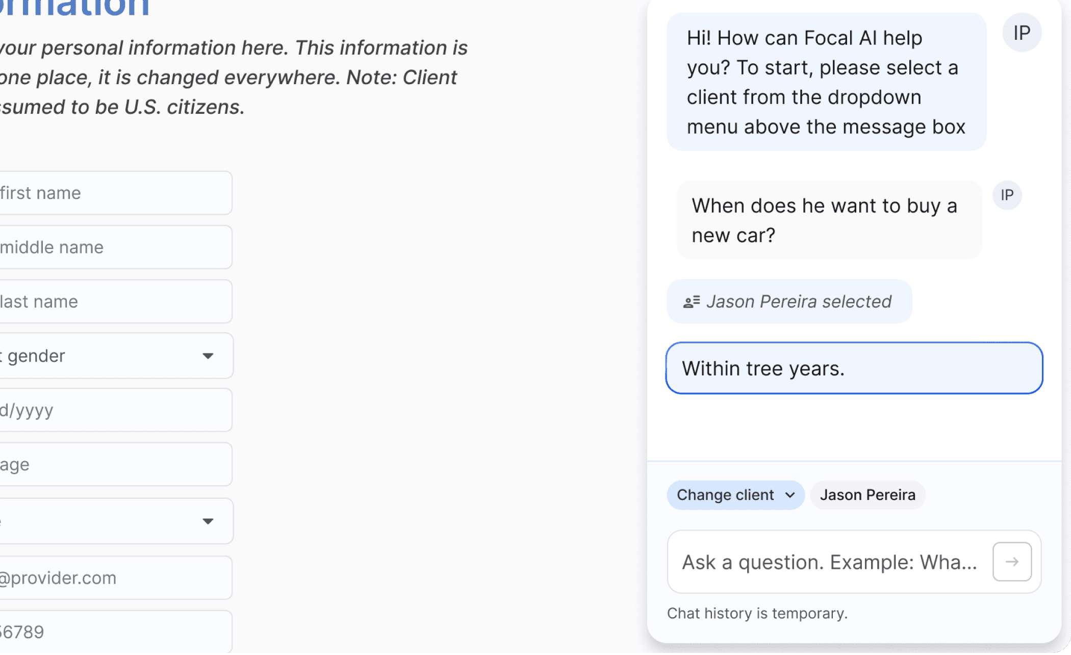 Query any client information in Seconds. Once a client is selected, ask Focal natural language questions about their data, profile, or history, and get immediate answers across all connected tools.