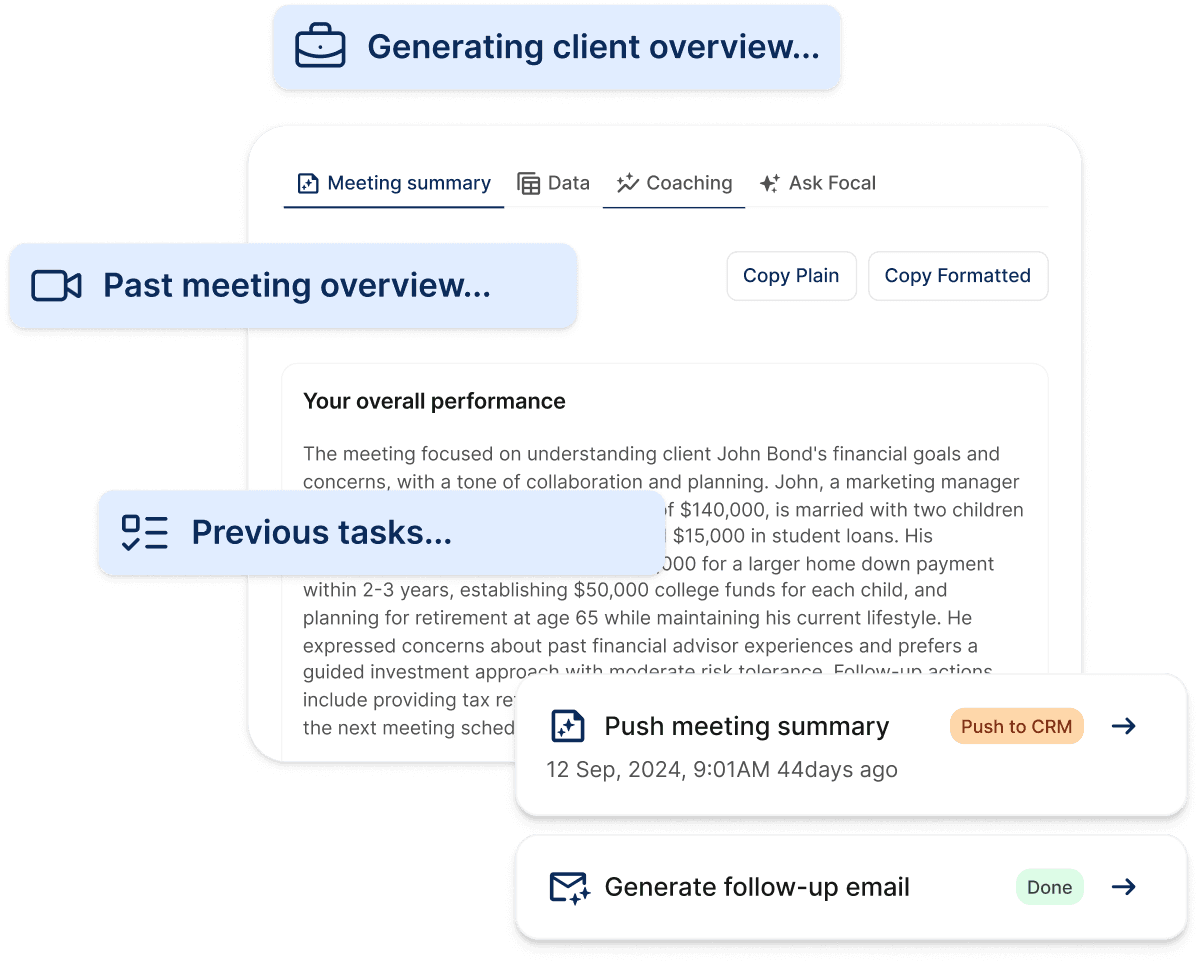 Focal automatically checks your calendar, CRM, and notes, to generate a meeting agenda, pre-meeting email, and 360-degree client overview.